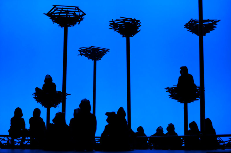 Оркестр задействован не был, на сцене прямо рядом с артистами трудились аккордеонистка Анне Нипольд и флейтист Стефан Браковал. Моцарта исполняла... шарманка. Перфорированные карты аккуратно шли по кругу, душевно сипели трубки, и нам удалось прослушать арию Папагено в непрофессиональном напевании артиста Хайдера Аль Тимими, арию Царицы ночи в исполнении почему-то Памины (Хадевих Де Мейстер) и дуэт Папагено и Папагены, также перелицованный для Памины и Тамино (дисканта Корнила Ван Несте).