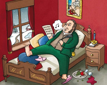 сопрано и баритон поют наперебой, закатывая глаза, названия излюбленных блюд Россини,