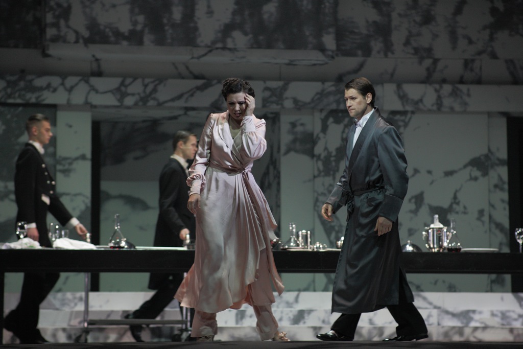 С одной стороны, мы имеем дело с классической структурой мизансцен, обрамленных в лаконичный мраморный багет сценографии Андриса Фрейбергса. С другой стороны,