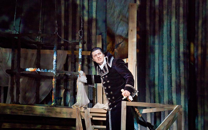 Каварадосси в ослепительно белой рубашке и чёрном галстуке предстаёт в спектакле в образе художника-романтика.