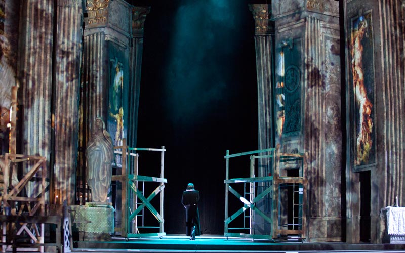 Первое действие, традиционно, разворачивается в капелле. Однако барочный, полный света и ярких красок интерьер Сант-Андреа-делла-Валле становится тёмным, с преобладанием серого цвета.