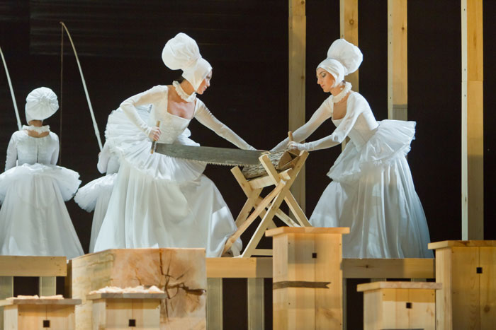 Пожалуй, Балакина посетило воистину гениальное прозрение — скоррелировать два образных мира, абсолютно различных по происхождению, но оказывающихся созвучными друг другу. Елена Вершинина одевает персонажи в костюмы «от Магритта», и ощущение того, что Магритт писал свои картины как декорации к «Пиковой даме» полное!
