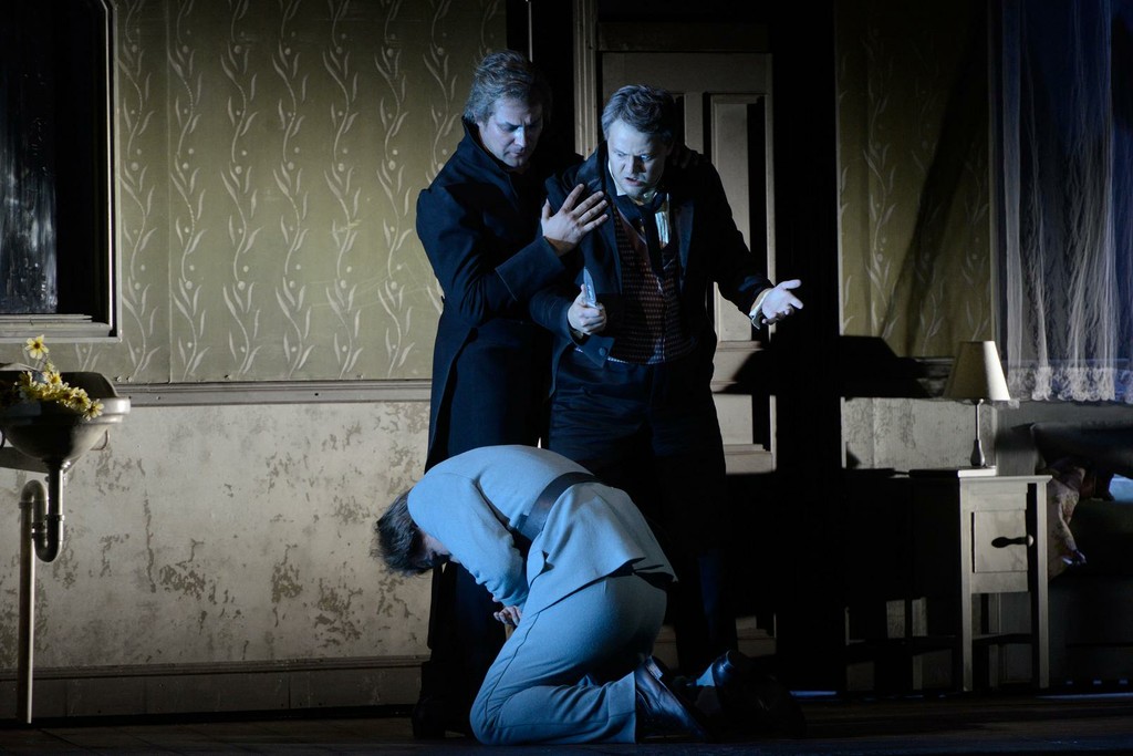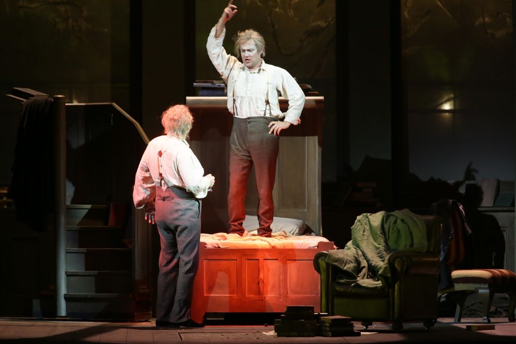 В прологе (по редакции театра это первый акт) предстают два немощных, эстетически отталкивающих старика с лицами в набеленных полумасках. Мефистофель вообще вылезает из-за спины Фауста из его же постели, такой же неопрятный и ворчливый, лишь более ироничный. Никакая он здесь не инфернальная сила, договор старого ученого с дьяволом, похоже, — просто сделка с самим собой. В финале акта в коротком дуэте оба господина одновременно натягивают штаны, жилеты, подхватывают пиджаки — и исчезают.