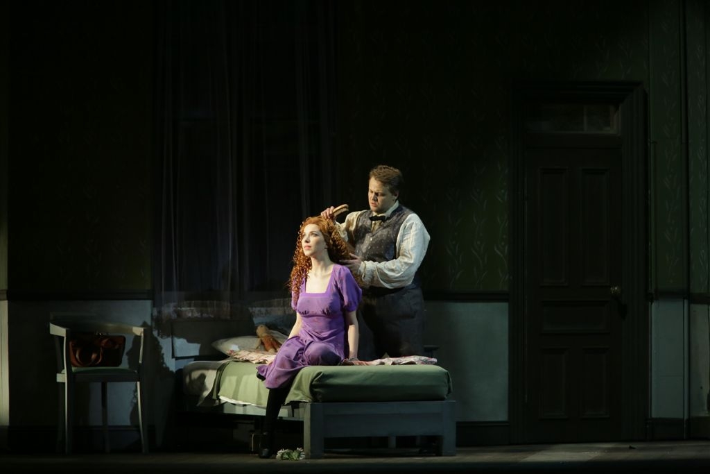 Сергей Семишкур и Екатерина Гончарова, оба хорошо владеющие вокалом, молодые, привлекательные, ведут себя естественно и просто. В дуэте, зачарованный прелестью Маргариты, Фауст одевает на любимую украшения так, словно создает произведение искусства. Чуть позже, подавив в себе чувственный порыв, он приближается к девушке и начинает расчесывать гребнем ее роскошные рыжие кудри. В следующей части спектакля Маргарита на той же скромной кровати лежит скорчившись, а на полу валяется окровавленный сверток. Все просто до натуралистичности. И уместно в выбранной стилистике спектакля.