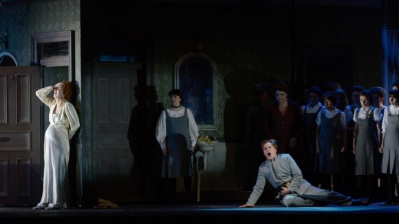 Эта тема прочитана постановщиком в духе готического романа. Все темное и тревожное из глубин подсознания героев обретает гротескно-жуткие образы в лице молчаливых слуг просцениума. Невольно вспоминаешь «Огненного ангела» Прокофьева, точнее, спектакль Дэвида Фримана в Мариинском, где видения Ренаты реализовались в виде червеобразных существ (гимнасты), преследующих героиню.