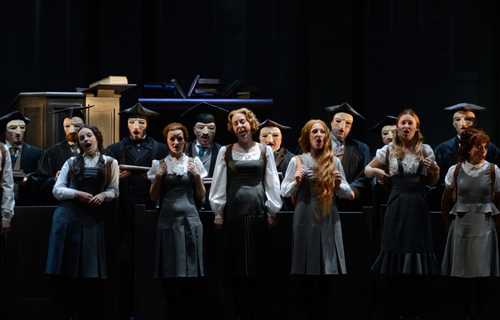 Но вот начинаются танцы. Сначала аккуратные гимназистки в серых форменных платьях (такое же на Маргарите) чинно танцуют с солдатами, потом юношей-солдат незаметно вытесняют монстры-демоны, в танец включаются женщины-демоницы в экстравагантных туалетах. Вальс все больше приобретает налет гротеска, в оркестре маэстро Гергиев чуть педалирует звуки — отблески Фантастической симфонии Берлиоза, нежный добропорядочный вальс постепенно превращается в адскую оргию. На мой взгляд, сделанный совместно с хореографом Дмитрием Пимоновым, этот фрагмент очень удачен.
