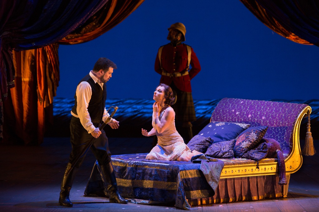 Схема проста: Англия – завоеватель, Индия – колония. Но, впрочем, Индия – это наиболее удобная зацепка. Иногда кажется, что мы – то в Турции, то на арабском Востоке. Согласно либретто Хайма, в котором слабым пунктиром отразились события гражданской войны в Риме 48 – 47 годов до нашей эры, Цезарь, нанесший поражение своему сопернику Помпею и преследующий его до Александрии, в столицу Древнего Египта попадает, можно сказать, «случайно». «Еще более случайно» в этой постановке «англичанин Помпей», преследуемый «англичанином Цезарем», бежит именно в «Индию-Египет», где правят Клеопатра и ее младший брат Птолемей, последние представители династии, взошедшей на трон Египта после завоевания его еще Александром Македонским.