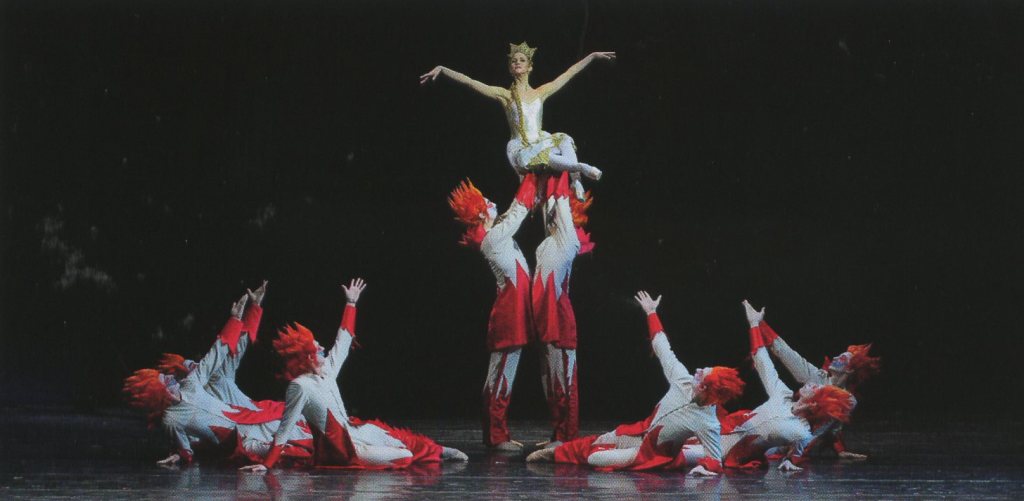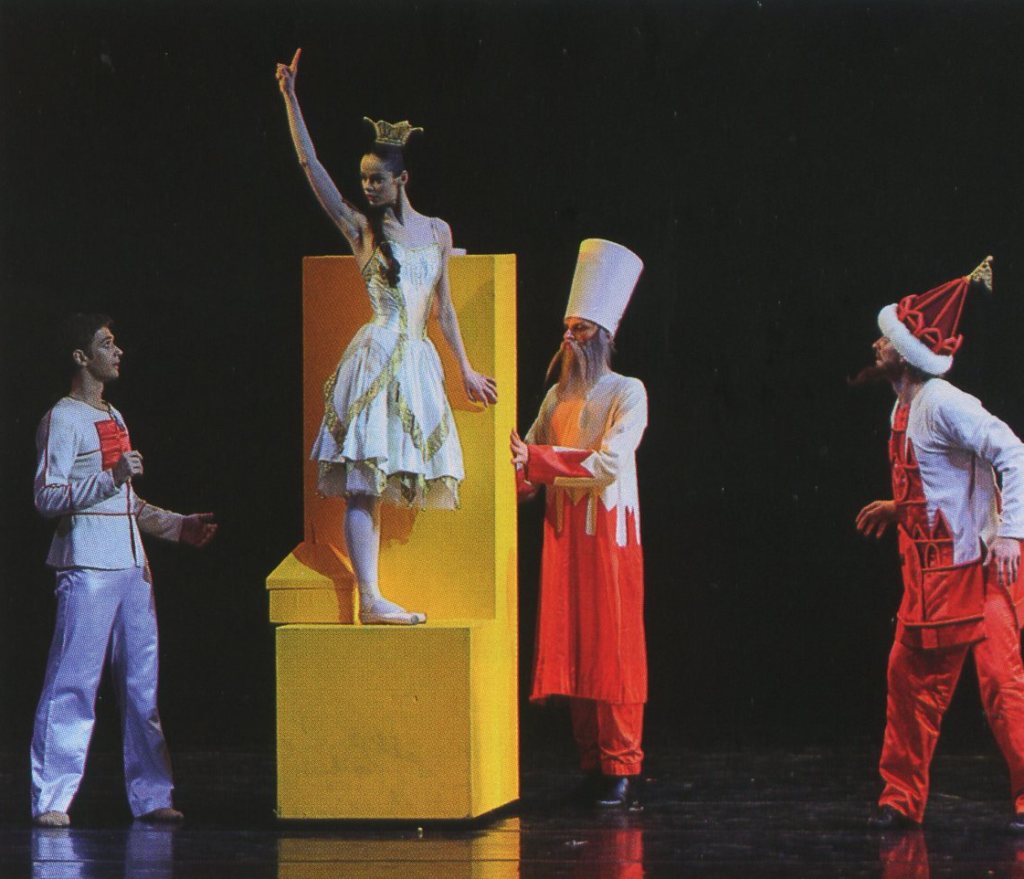 А в сцене бала дурачился балетмейстер-сочинитель: чуждый какого-либо пафоса, он разрушал пафос сказочности. Вторя иронии, пронизывающей музыкальную тему Сергея Прокофьева, он создал пародию на традиционное сказочное представление о придворном обществе: то светские львы и львицы неуклюже переминались с ноги на ногу, то дамы жеманно потряхивали кистями, а кавалеры, сильно наклонив корпус, в глубоком плие скакали через сцену в па мазурки.