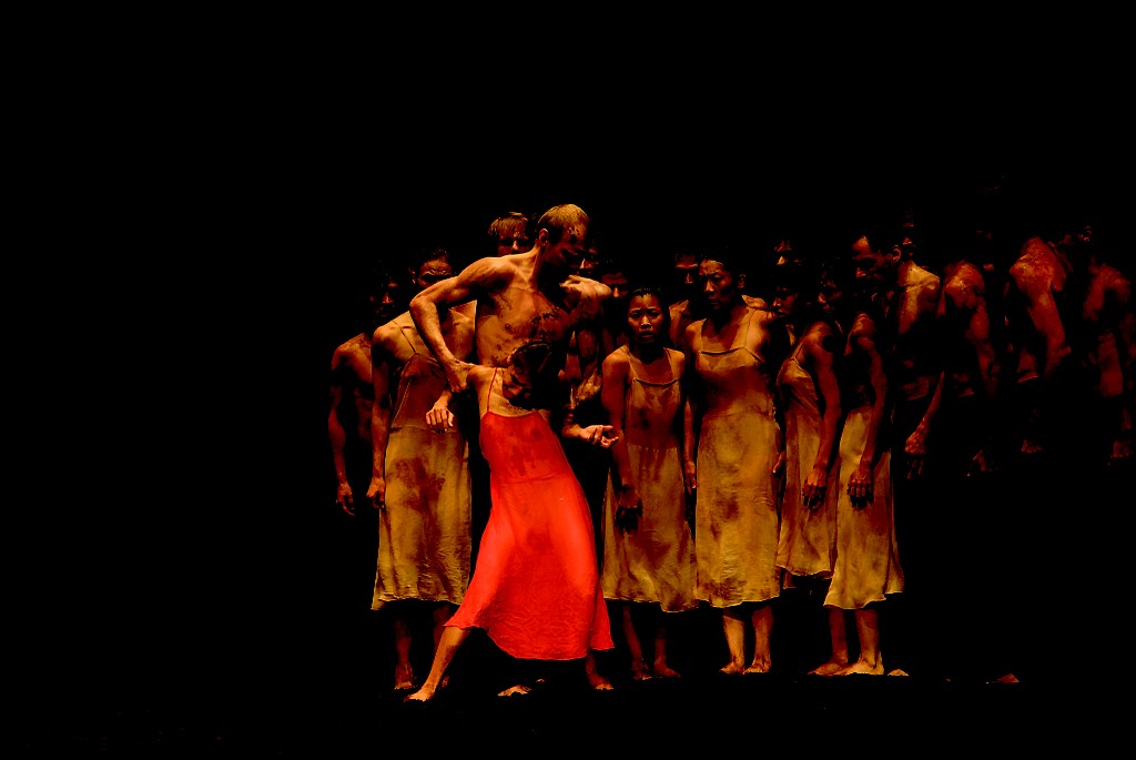 Разнообразие костюмов там и бело-коричнево-чёрные простейшие одежды здесь, с одним пронзительным алым пятном сарафана Избранной. Земля, мало по малу оставляющая свои следы на лицах, торсах и одеждах исполнителей... Никакого отношение к славянской культуре, Нижинскому и прочему.
