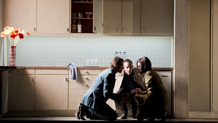 Главную роль в сценографии спектакля (Кристиан Шмидт) играет вращающаяся сцена с обычной городской среднестатистической квартирой, в которой «течет» жизнь, сцена в гостиной «переходит» в спальню, на кухню, в туалет и т. д.