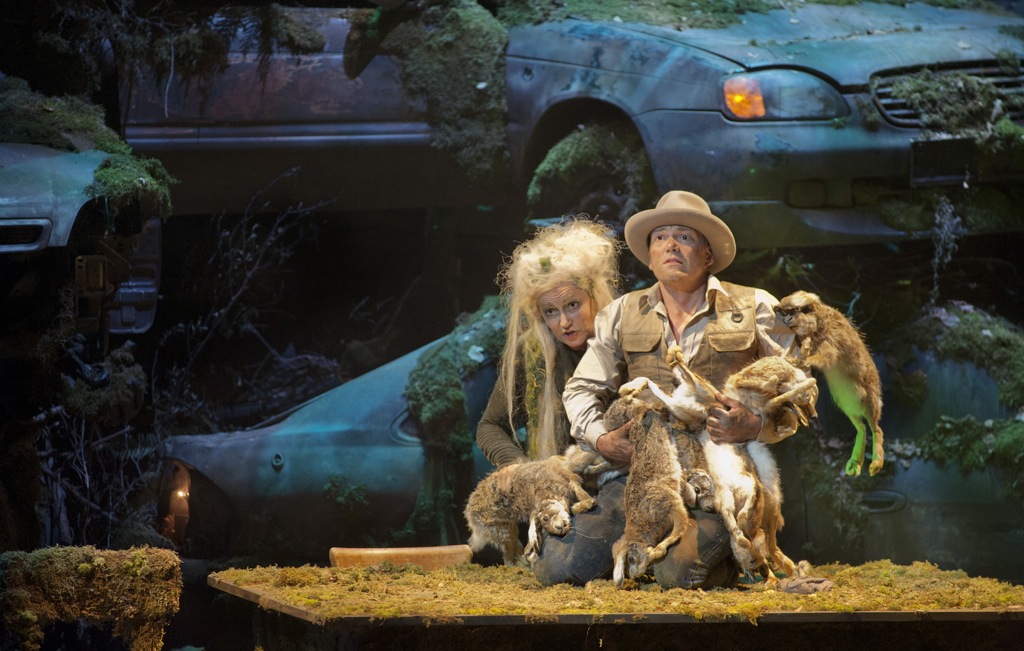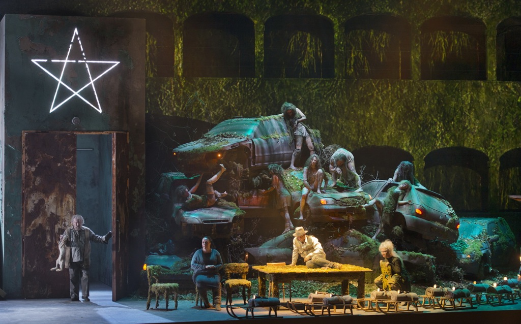 Если не знать легенды, на сцене трудно что-либо понять. Но можно прочитать либретто. Между тем, режиссеру мало сложностей восприятия саги. Рыцаря Гавейна он ассоциировал с Йозефом Бойсом, немецким художником-инсталлятором и борцом за экологию. Очевидно, сработали ассоциации со словом «зелёный».