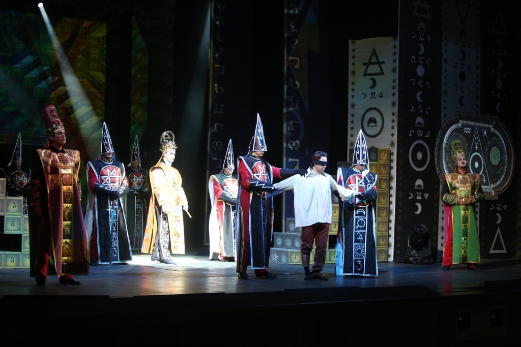 Короб из ширм-занавесов, маленький балаганный театр, что располагается в центре сцены, словно волшебный фонарь фокусника дает огромные возможности постановщикам. Великолепны костюмы — по-настоящему сказочные, загадочные, какие-то неведомые и даже где-то инопланетные (как у трёх дам-валькирий Царицы ночи), прекрасно организован интерактив со зрительным залом.