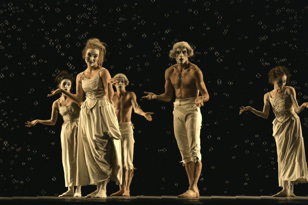 — электронный минимализм в перебивке с тревожными немузыкальными, а иной раз и неритмичными, звуками и шумами, а не ласкающий уши Моцарт, замедленная, медитативная, а не забавная и не стремительная хореография. И, как результат, более скромная сценическая история. Но восприятие этого сумрачного балета облегчают театральные подпорки.