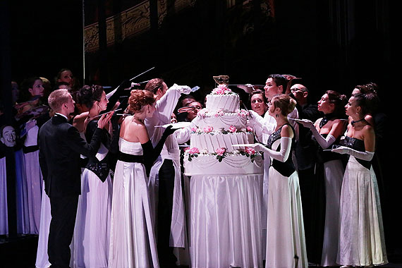 На финальном балу на потеху публике участники маскарада являются, прикрывая лица легко узнаваемыми физиономиями героев масскульта — политиков, артистов и пр., а в самом конце, когда уже Ричарда «порешил» его друг Ренато, выносят большой розовый торт и вся тусовка, забыв об убиенном властелине, устремляется отщипнуть себе кусок пирога пожирнее.