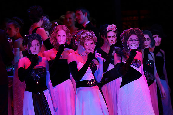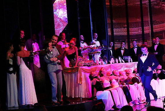 Сцену от публики отгораживает ярко красный занавес, на котором изображен зал одного из красивейших оперных театров мира — какого даже не столь важно. Программка утверждает, что это вид Королевской оперы в Стокгольме, но здорово смахивает и на парижскую «Гранд-опера» и ещё на десяток приторно оформленных пространств времен расцвета оперного жанра. Это единственно запоминающаяся картинка за весь спектакль: