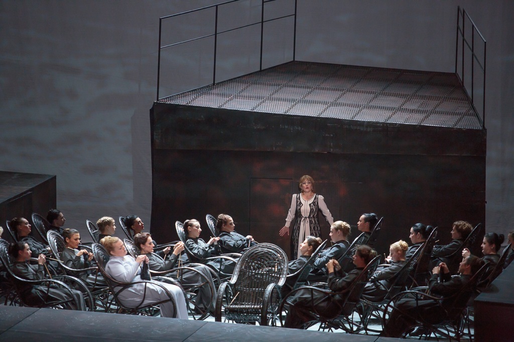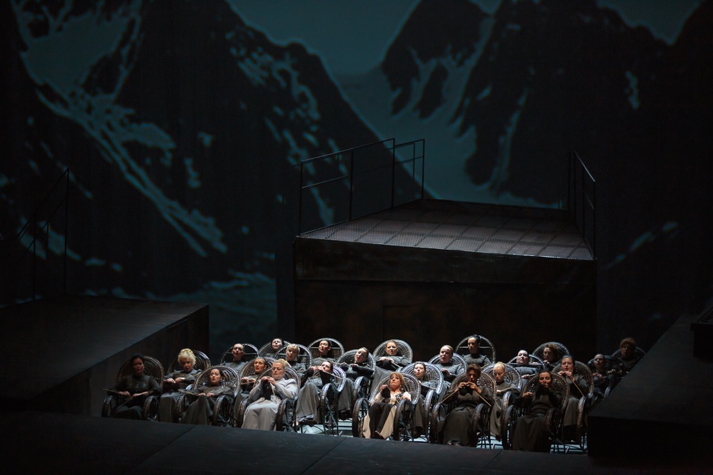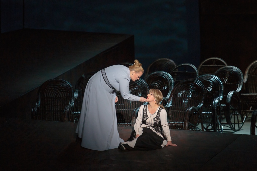 Мир Даланда и Сенты, мир рыбацкого норвежского посёлка предстаёт чинным обществом чеховской поры (судя по костюмам), а вместо прялок девушки во втором акте все как одна усажены в кресла-качалки, мерно фланирующие в такт музыке: не по Вагнеру, но, в общем-то, и не поперёк ему.