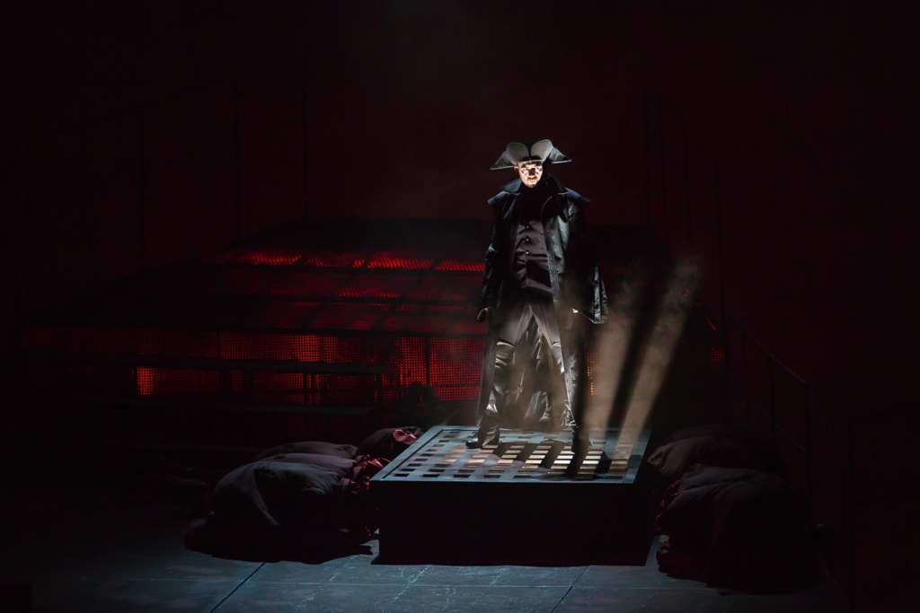 При том, что ярких цветовых пятен в спектакле как бы и много, единственное из них, которое по-настоящему запоминается и не выглядит тускло – это оперный занавес, предваряющий финальную сцену бала, на фоне которого Густаво (так в версии петербургского спектакля зовётся главный герой, в то время как всем прочим персонажам оставлены традиционные, «бостонские» имена) принимает решение об отъезде Амелии и Ренато в дальние края.