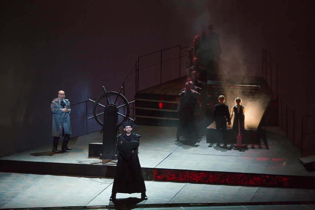 гигантский корабль, накренённый кормой к оркестровой яме, господствует на сцене, распадаясь на части в середине оперы и вновь собираясь к финалу; серо-чёрные тона утверждают мрачноватый колорит романтической оперы; видеопроекции на тюлевом занавесе, изображающие бурное море и строгие фьорды, дополняют визуальное впечатление, помноженное на возвышенное музыкальное повествование.