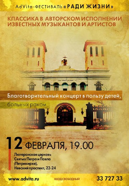 12 февраля Благотворительный фонд AdVita («Ради жизни») приглашает всех желающих на ежегодный благотворительный концерт к Международному дню детей, больных раком. Концерт состоится в Кафедральном соборе Святых апостолов Петра и Павла (Петрикирхе) по адресу: Санкт-Петербург, Невский проспект, 22–24. Начало концерта в 19.00, вход свободный.