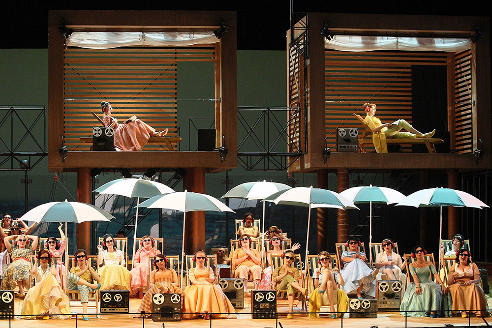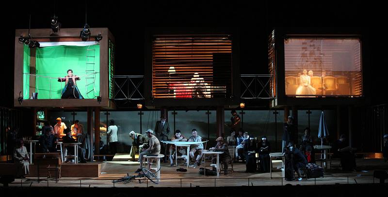 Оба привезённых спектакля — и «Летучий голландец», и «Евгений Онегин» — именно таковы. Первый сделал Василий Бархатов, нынешний худрук оперной труппы театра. Самое занимательное в спектакле — сценография Николая Симонова, почему-то отсылающая в 1950-е с катушечными магнитофонами и клешированными юбками, пляжными зонтами и штормящим океаном — видеографика на заднике впечатляет. Сценография именно занимательна — она здорово отвлекает от музыки, поскольку постоянно требует твоего зрительского внимания. Впрочем, она не одинока в своём эгоизме, в перетягивании одеяла на себя.
