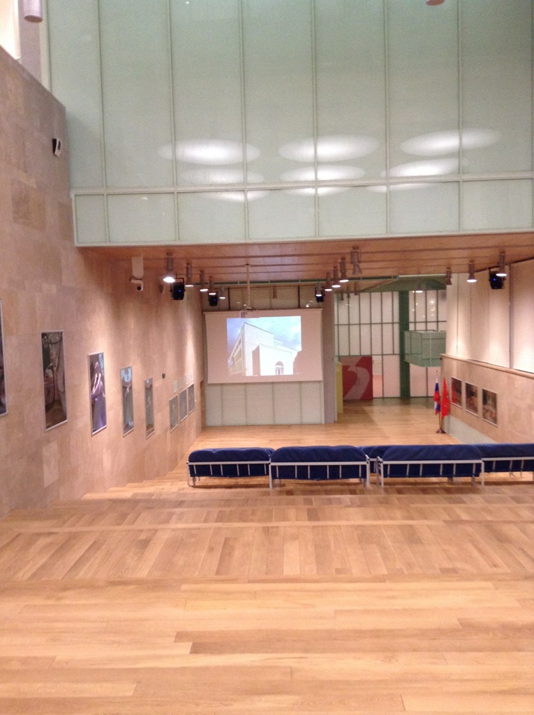 Просторный атриум разделяет здание на две части – в правой части находится пищеблок и интернат, в левой – 14 балетных классов с разноцветными полами.