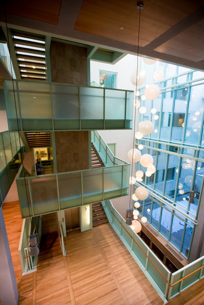В основу внутренней планировки школы положен «принцип аквариума», чтобы преподаватели в любой момент могли контролировать передвижение детей от общежития до класса, или из атриума в репетиционный зал. Стекло здесь сочетается не с обычным своим соседом — бетоном, а со стильным финским кирпичом и натуральным деревом.