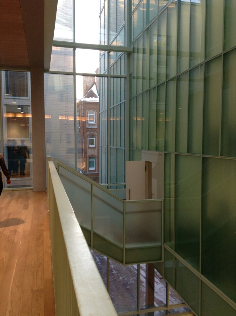 Фисташкового цвета стеклянные стены и деревянная лестница, уводящая далеко наверх — эти красоты начинаются прямо «с вешалки», видны из стеклянного гардеробного фойе.