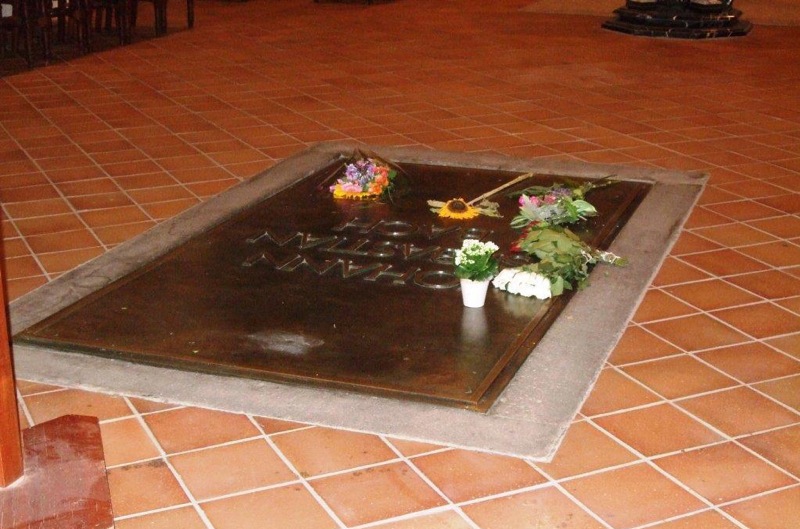 К тёмной плите надгробия в церкви сейчас вплотную подойти нельзя, но она тем не менее украшена цветами, вид которых говорит о том, что это вовсе не официальное приношение администрации музейного комплекса. Один цветок подсолнечника, букет фиалок, пара уснувших роз.