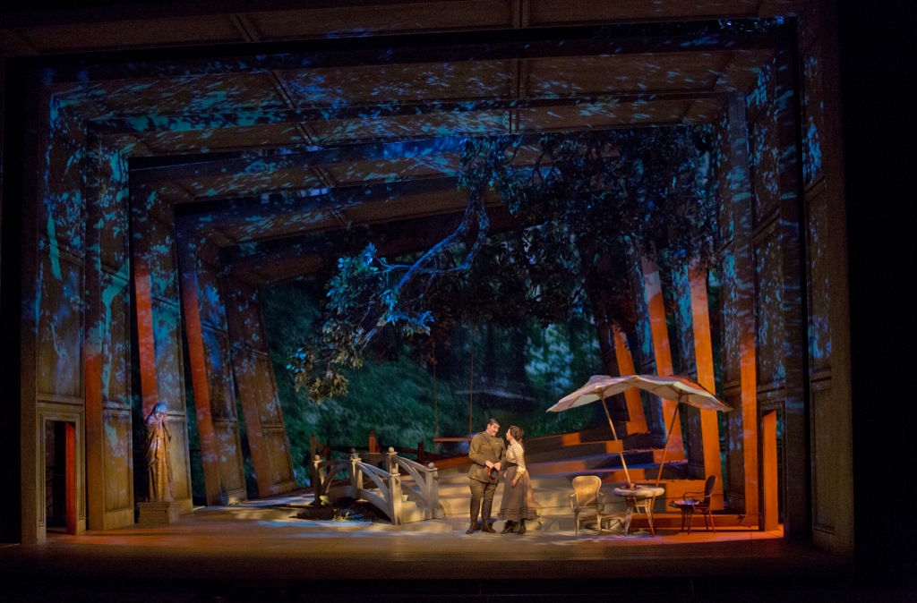 Свет и использование видеопроекций поставлены так, что дух захватывает: никакой эклектичности, искусственности; показывают смену времён года, например, и сердце замирает, как точно и нежно это соответствует каждому мелодическому изгибу в музыкальном вступлении к действию. Буквально на две минуты в первом действии, когда молодёжь отправляется на бал, игра света и подвижность декорационных выгородок создают феерическую картину «наезда камеры», и к зрителю сквозь листву приближается дом, стоящий за садом, его зал и кружащиеся пары гостей с ностальгической — иначе не скажешь — атмосферой провинциального праздника.