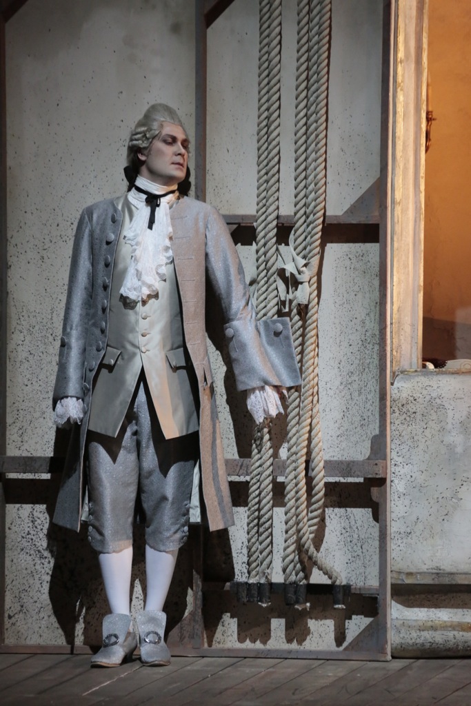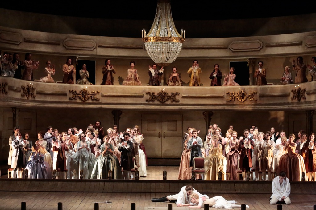 Странно, что в программке указан очередной «злодей-разрушитель», драматург Клаус Бертиш. В чём заслуга этого господина — непонятно. Предложил идею «театра в театре»? Вот так новость! Кроме зала на сцене с ложами и ярусами и нарочито исторической рампы и показной машинерии (вплоть до двигающих картонными волнами статистов) сюжет полностью следовал либретто Лоренцо да Понте.