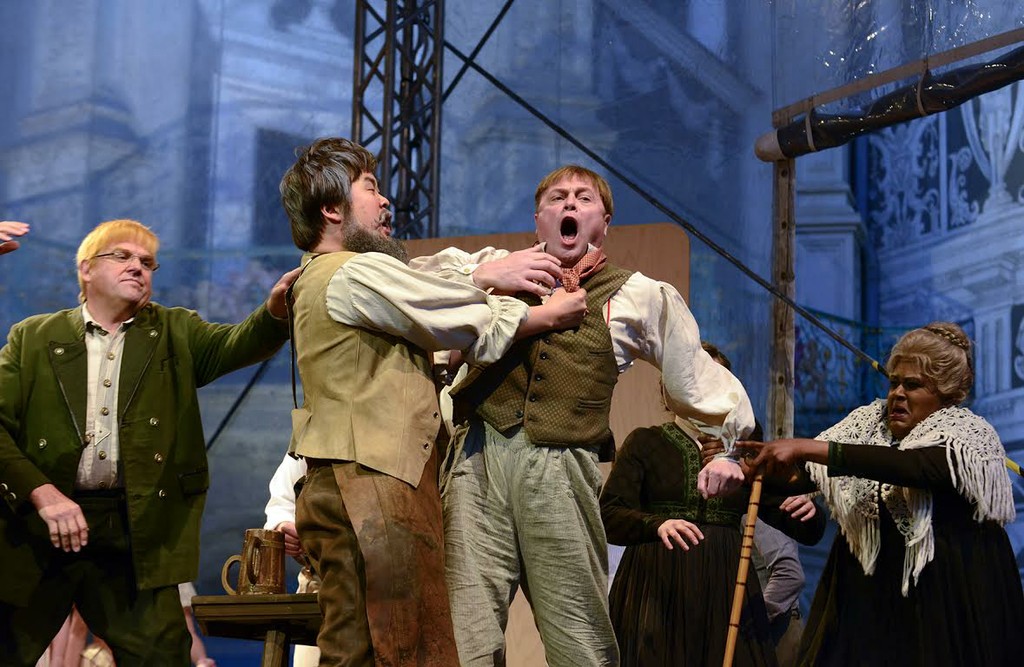 Ее режиссерская идея была проста — максимально использовать естественные декорации, уже имеющиеся в импровизированном театре: это кирпичная кладка замковой стены, куда она прикрепила корзинку, окошко, балка, бойница и т.д. На сцене разместился гигантский оркестр, оставив для персонажей полосочку возле рампы. Это будет место, где собираются мюнхенцы и обсуждают последние новости. У сцены разложили костер, дети (из городского хора и статисты), наряженные в национальные костюмчики, бродили вдоль рядов зрителей прямо во время спектакля. Такой намеренно примитивный интерактивный метод.
