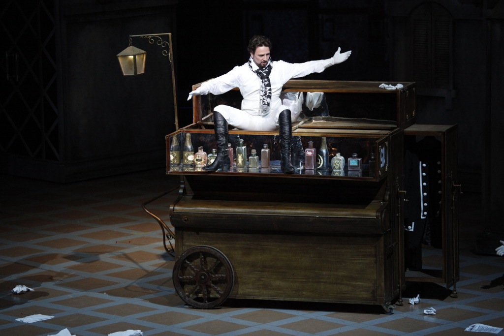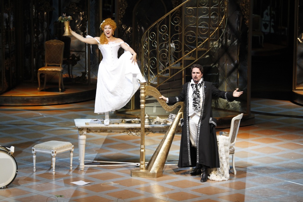 Для Михаила Панджавизде этот «Цирюльник» не первый. Но если в Белорусской опере он сделал театральное представление в стиле народной комедии дель арте, то в Самаре решил не выходить за рамки типичной оперы-буффа, так, как это и замышлялось Россини. Впрочем, сознательной театральной условности в самарском спектакле ничуть не меньше, нежели в минском, и уже при первых звуках увертюры, когда действующие лица галантно раскланиваются перед публикой, режиссер дает нам отчетливо понять — это всего лишь зрелище, не стоит искать здесь какой-то особой «сермяжной правды».