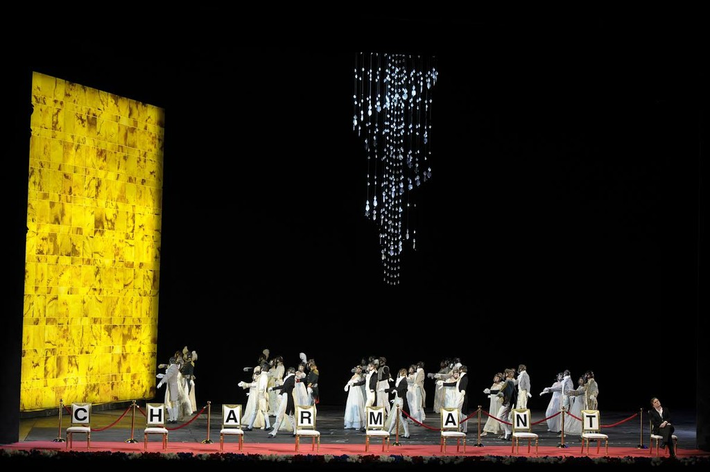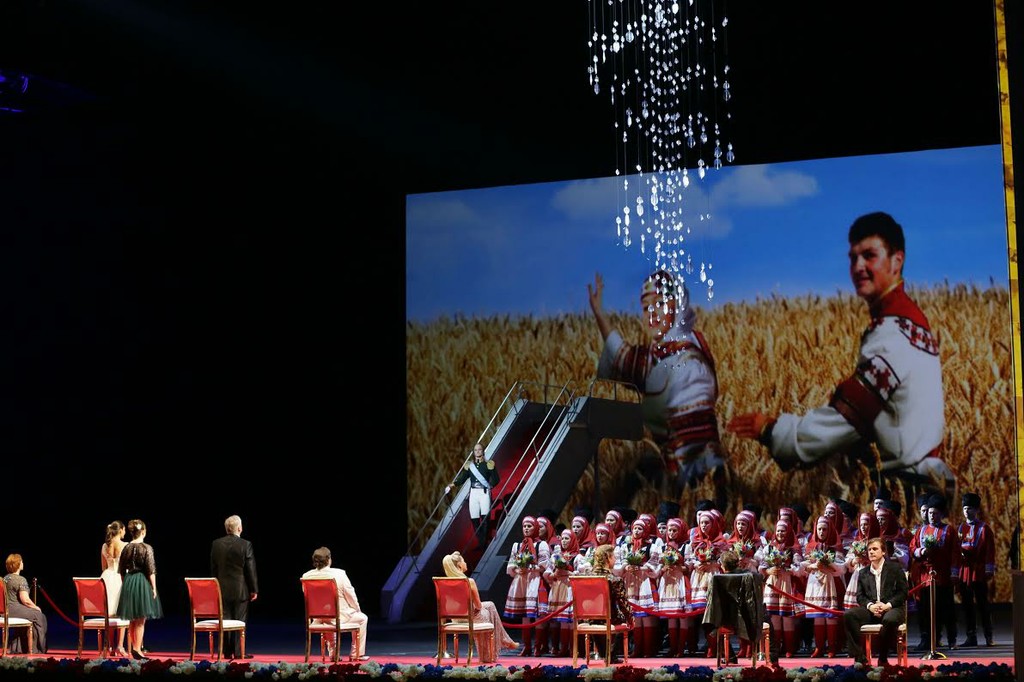 К позитивному обучающему воздействию сценографии можно причислить разве что толстовские фразы, вроде «пустая и гадкая женщина», будто для заучивания написанные на декорациях-трансформерах циклопическими буквами в стиле «наш друг Пишичитай». Да еще сценографические детали в виде янтарной стены, занавеса исторической сцены и витой люстры из концертного зала отчасти заменяют экскурсию по Мариинскому театру.