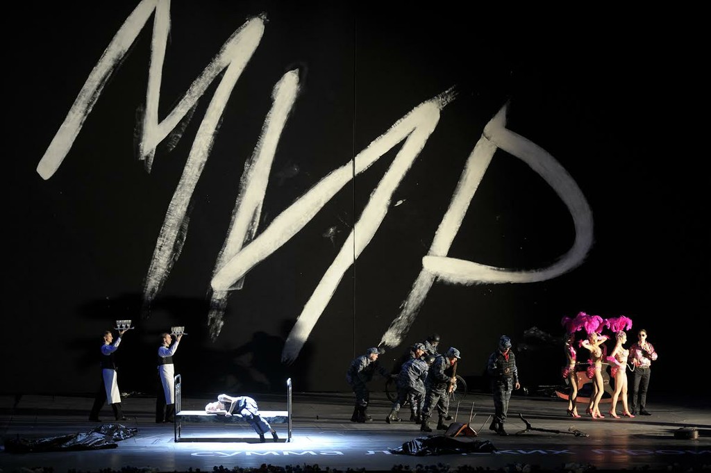 На поверхностный взгляд концепция пристойна: режиссер всеми способами вдалбливает, что война — это очень плохо. В начале второго действия на Бородинском поле солдаты не строят укрепления, а роют могилы (гробы прибывают позже). На глобальность пацифистской идеи намекают костюмы: под штандартами цветов французского флага разгуливают солдаты с автоматами в современном камуфляже и немецких касках времен Второй мировой войны.