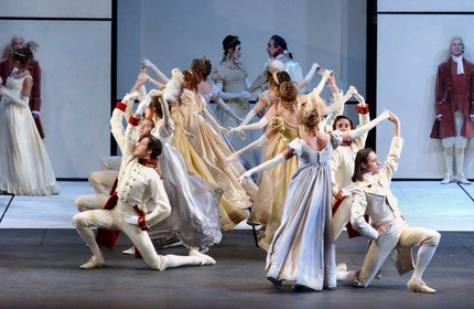 Ну, неужели в оперу приходят затем, чтобы посмотреть, как старик Болконский на словах «зашел в таком костюме» распахивает халат, потрясая перед залом подштанниками (в них же старый князь выходит на поклоны)? Да и под освоением сценического пространства любители музыкального театра обычно понимают вовсе не разъезжающие по сцене лимузин (настоящий) и танк Т-34-85 (к счастью, макет, но в натуральную величину — ведь сцена позволяет). Едва ли заставит уронить слезу умиления ключевая сцена «мирного» действия — знаменитый прокофьевский вальс, который миманс танцует в плексигласовых лицевых щитках (спасибо, что не в костюмах химзащиты), а главные герои — без.
