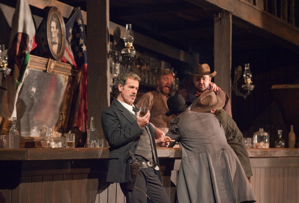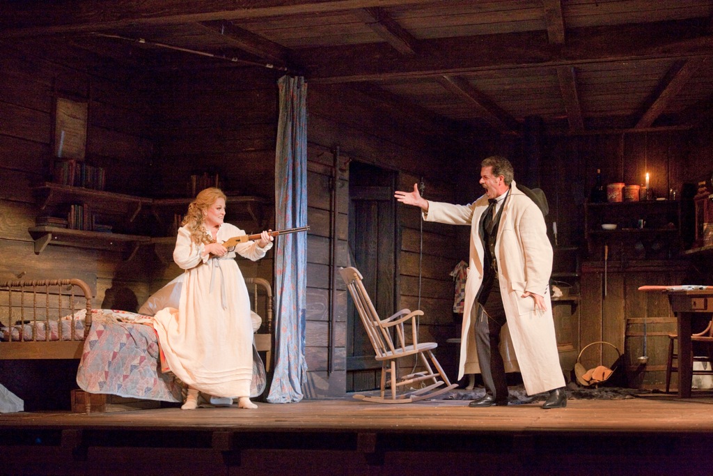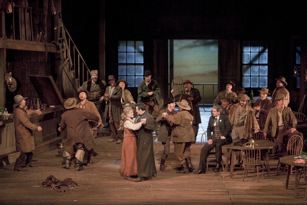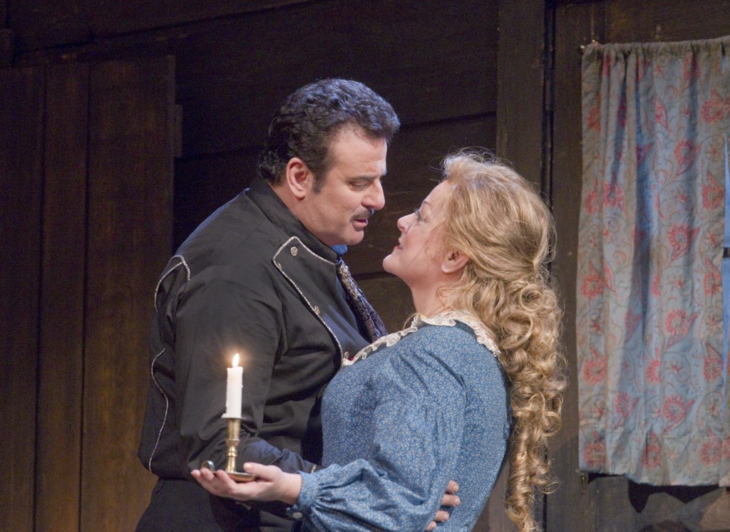 Говоря о тройке главных персонажей «Девушки с Запада», начнем по возрастанию впечатлений. В 2005 году Лучио Галло, исполнителя партии Джека Рэйнса, в той же самой роли мне уже довелось услышать на Фестивале Пуччини в Торре дель Лаго. Даже с поправкой на всю проблемность «акустики» открытого пленэра, в музыкальном отношении у себя на родине певец предстал куда более интересным, чем в рамках обсуждаемого заокеанского ангажемента, который последовал через три с половиной года: звучание голоса на сей раз предстало каким-то сработанным, глухим. Но, не захватив в вокальном плане, актерски этот исполнитель однозначно сумел обратить на себя внимание. Вместе с тем слащавый типаж образа Дика Джонсона, созданный еще одним итальянцем Марчелло Джордани, не очень-то вязался с обликом матерого бандита. Вокально певец был очень даже неплох, но достаточно мощная лирическая спинтовость его звучания всё же до конца убедить не смогла: в этой драматически насыщенной партии как раз недостаток драматической наполненности звуковедения ощущался больше всего.