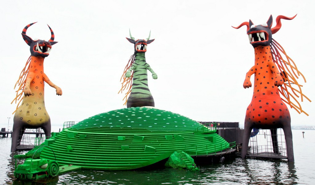 Памина прибывает на большой лодке, на переливающейся разными оттенками черепахе появляются три мальчика, в воды озера соскальзывает змей, преследующий Тамино, и пара дублеров влюбленной пары погружается в холодные воды Бодензее в сцене испытаний.