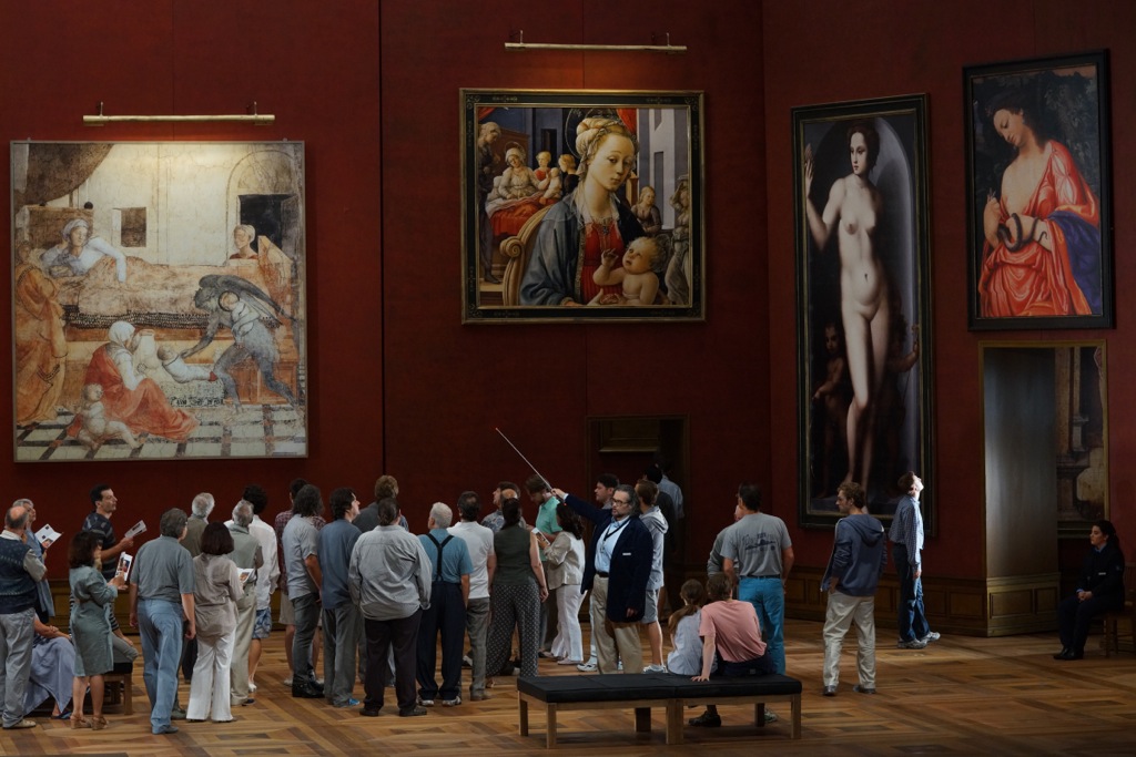 Постепенно все, в том числе и посетители музея (они же — великолепно звучащий хор) переодеваются в тёмно-красные костюмы, стилизующие одежду эпохи Возрождения; подобную той, что изображена на окружающих картинах. По ходу спектакля картины эти — портреты, Мадонны, Венеры, религиозные, древнемифологические сюжеты и сцены средневековых турниров — беспрестанно двигаются, изменяя тематику в соответствии, а иногда без соответствия событиям и моделируя конфигурацию пространства.