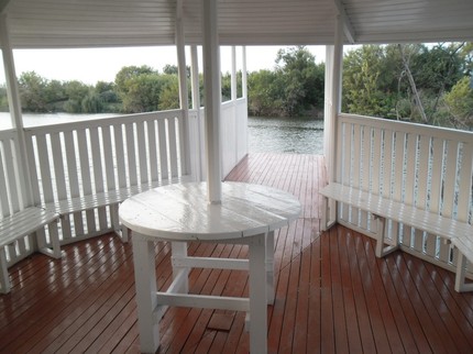 Такой же белой расцветки мебель, беседки, скамейки щедро расставлены по всей усадьбе, а рядом с усадебным домом на перекладине подвешен колокол: