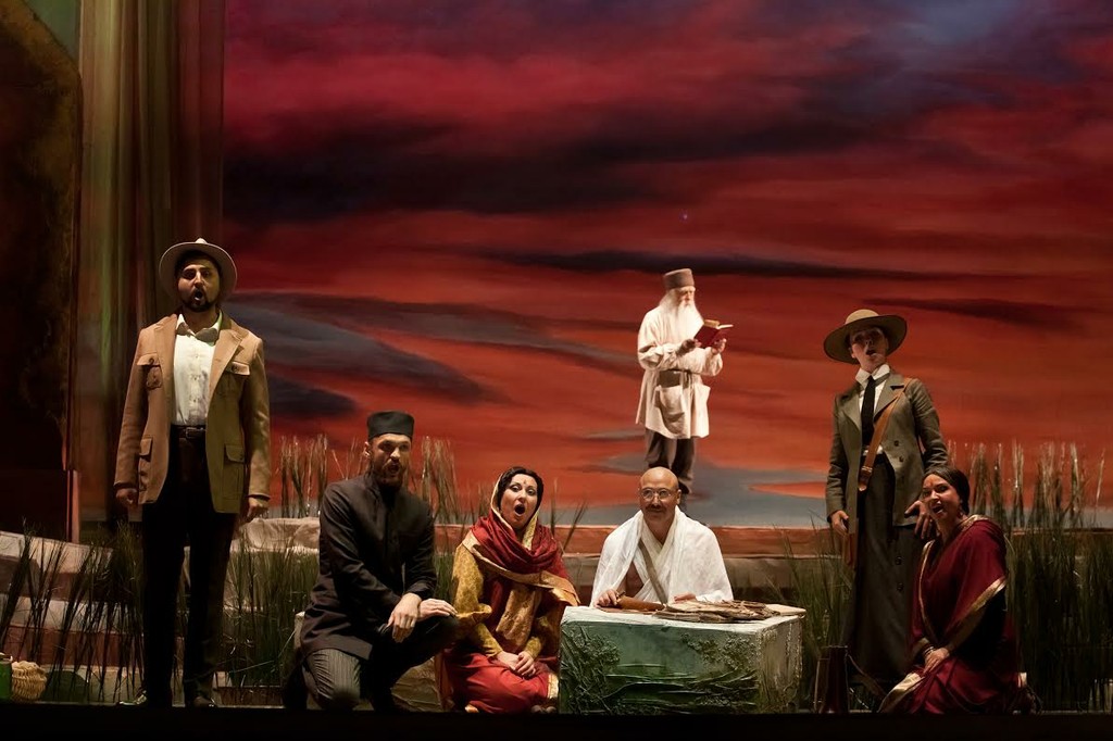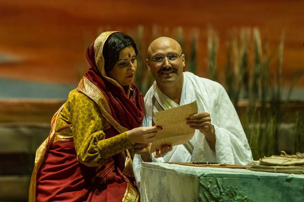 В опере нет линейного сюжета, она представляет собой череду эпизодов, связанных друг с другом фигурой Махатмы Ганди.