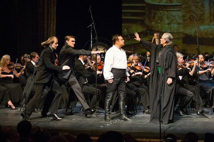 Как это бывает в театре, энергетика опытного певца создала ауру, в которой молодые артисты вдохновенно, с впечатляющей самоотдачей исполняли роли, не входящие в их театральный репертуар. Прежде всего, это относится к Тоске Ольги Терентьевой, прозвучавшей предельно эмоционально и с необходимой выразительностью спевшей «Vissi d’arte». Небольшую в этом действии партию Каварадосси добротно озвучил Александр Скварко.