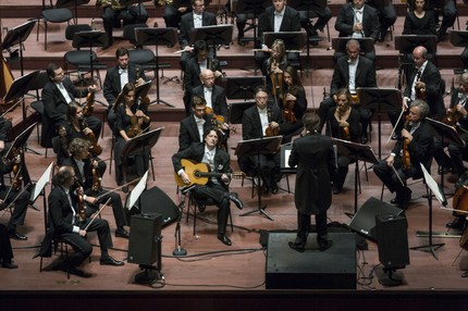 Самым топовым номером второго отделения стал блестяще исполненный знаменитый хит Хоакина Родриго — Концерт «Аранхуэс» для гитары с оркестром (1939). Вживую этот опус в наших отечественных концертных залах мне приходилось слышать не раз, но такое сильное эмоциональное потрясение от него я испытал впервые. Солировал испанский гитарист Хуан Мануэль Канизарес, но это имя, прочитанное в программке, так и оставалось для меня просто именем, пока не зазвучали первые гитарные аккорды, которые оставить равнодушным просто уже не могли. Гитара в классическом репертуаре — инструмент очень прихотливый, тонкий, но на этот раз волна музыкальной медитации ее звуков захватила на каком-то необъяснимом, подсознательном уровне.