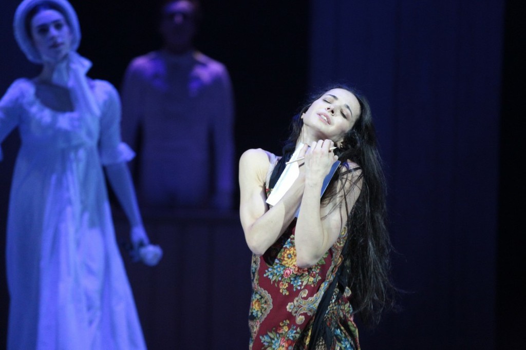 Татьяна (Диана Вишнева, приглашенная звезда театра Станиславского) живет в мире грез, в котором персонажи ее любимых книг столько же реальны, что и родственники с соседями. Даже письмо Онегину она пишет вместе с героинями любимых романов.