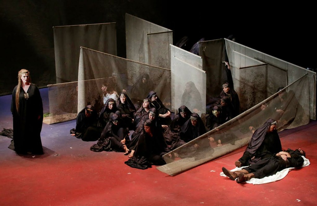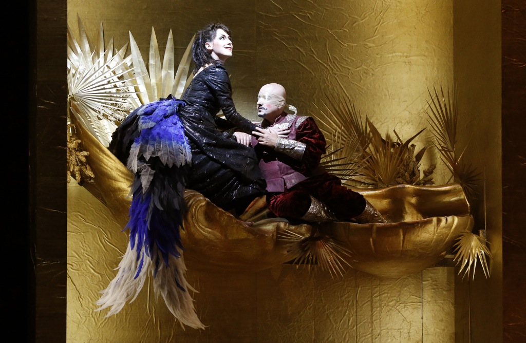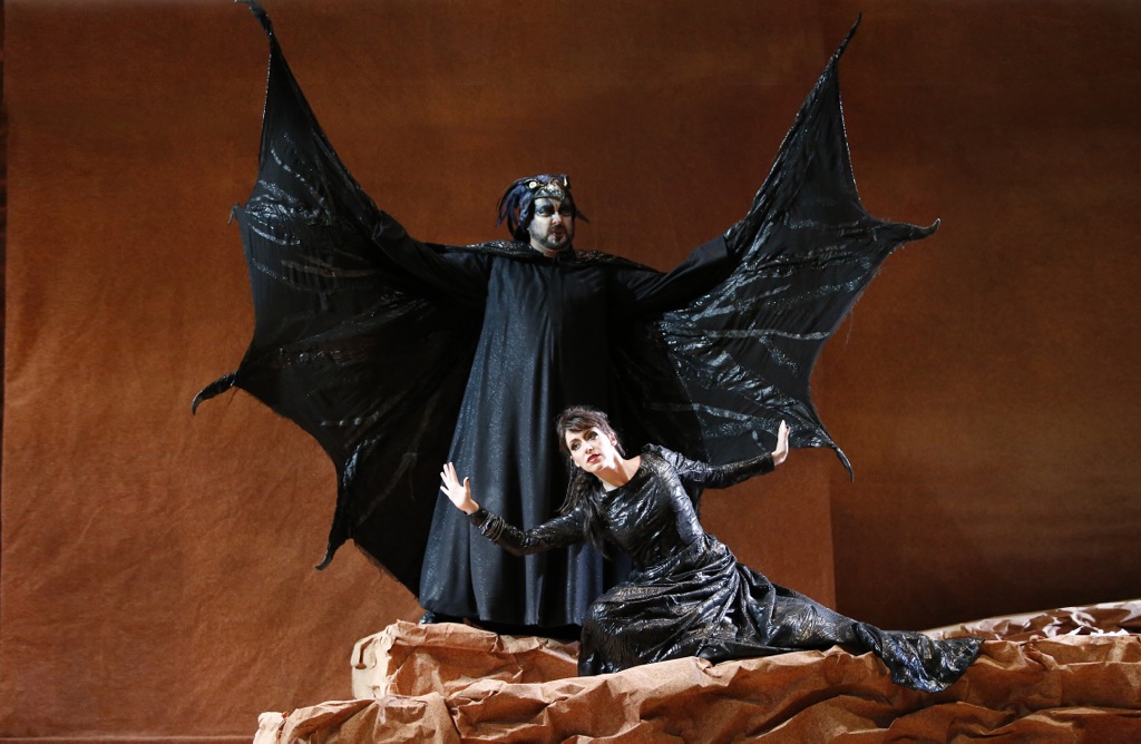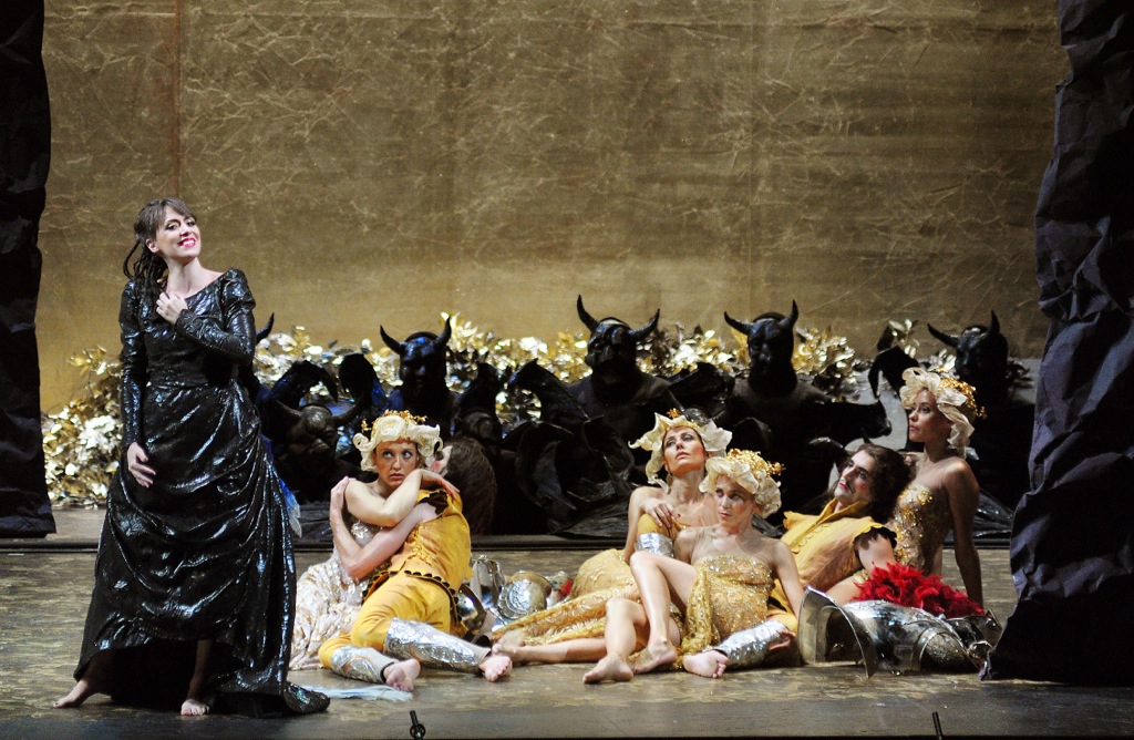 Она напоминала лабиринт из невесомых ширм-суперзанавесов, колышущихся от малейшего дуновения ветерка, то и дело поднимавшихся и опускавшихся, а также менявших степень своей прозрачности с помощью партитуры света, придуманной Паскуале Мари. Именно между этими ширмами и на их фоне перемещались и лицедействовали солисты и хористы, а где-то в глубине лабиринта в лучших традициях студийной эстетики стоял и «рояль в кустах» – инструментарий basso continuo: клавесин и виолончельный пульт. Музыканты, солировавшие на них, зачем-то были вовлечены в сомнительные мимические мизансцены, но всё, что им удалось на артистическом фронте, – это создать хорошую мину при плохой игре…