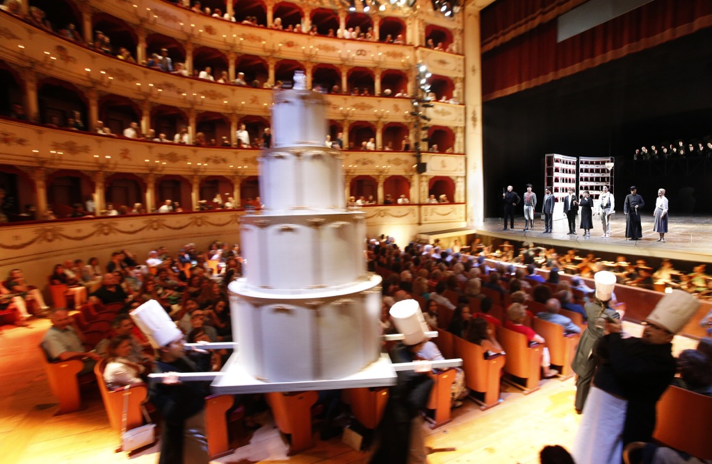О «соломенных вехах», то есть о надуманных ширмочках «с роялем», простите, «с клавесином continuo в кустах», а также о живых козочках, жующих настоящую зеленую травку в постановке «Аурелиано в Пальмире», речь шла в прошлый раз. Кажется, постановщики изо всех сил (правда, тщетно) старались проявить свое профессиональное прилежание. Сидя в зрительном зале Teatro Rossini, видом пасущихся «на лугу» козочек мы, конечно же, умилились, но воздушные ширмочки-суперзанавесы – поднимающиеся и опускающиеся – оскомину по ходу спектакля успели набить изрядно.