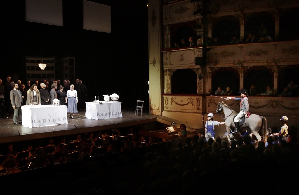 Если гоголевская «планировка» в «Аурелиано в Пальмире» была лишь малоискусной имитацией сценографического ряда, то в «Севильском цирюльнике», рожденном на свет молодежной постановочной командой Академии изящных искусств Урбино на той же театральной сцене, эта недвусмысленная и довольно-таки примитивная «планировка», исходя из эстетики semi-stage продукции, собственно, и стала ее основным содержанием. И если сравнивать ожидания от полноценного спектакля и полусценической версии, то, как ни странно, исходя из объективных возможностей эстетики обоих подходов, иллюзия бурной творческой деятельности «постановщиков-градоправителей» от театра именно в урбинском «Цирюльнике» не только не набила оскомину, но и в чем-то предстала даже весьма живой, удивительно искренней, ненаигранной, захватывающей. Но всё же один вопрос неизбежно возникает: «Хорошо или плохо, что такую хрестоматийную оперу, зажигательные мелодии которой легко опознáет даже самый неискушенный представитель широкой публики, поставили именно так, а не иначе?»