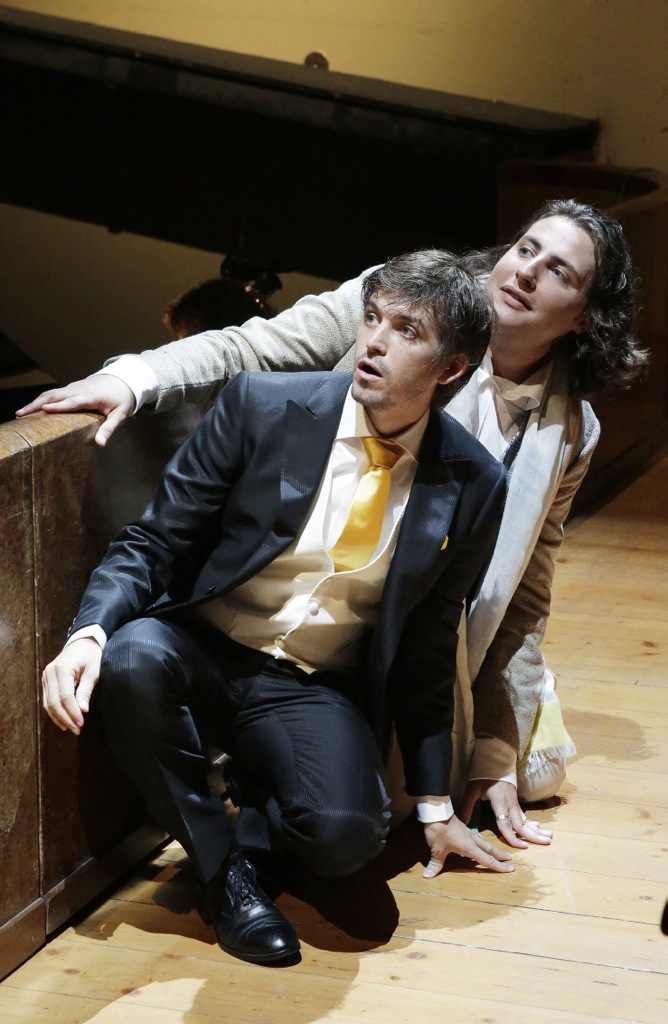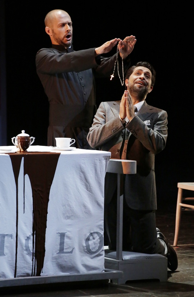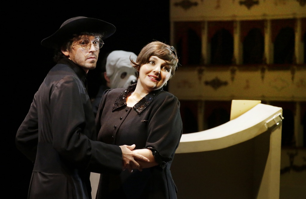 Итак, молодежной студенческой команде Академии изящных искусств Урбино принадлежали сам замысел, разработка проекта, элементы сценографии, режиссерские мизансцены, видеоряд и костюмы, в подборке которых, впрочем, никакой фантазии проявлено не было. Зато существенная ставка этой командой делалась на интерактивность актерского контакта с публикой: действие очень бойко переносилось со сцены в зрительный зал, для ряда мизансцен площадками становились проходы между местами в партере, а для появления и «исчезновения» многих персонажей использовались зрительские входы. И такой принцип явно располагал к доверию даже в отсутствие театральности, за которой, собственно, мы и приходим в театр, в том числе и оперный.