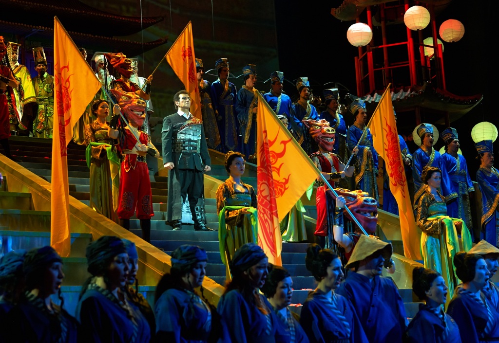 Этот спектакль превосходно решен в плане создания эпической атмосферы сказочной ориентальности (сценограф – Игорь Гриневич), однако отдельные современные штрихи, всё же вторгаясь в него, парадоксально придают визуальному ряду лишь еще бóльшую загадочность. Этот же принцип прослеживается и в изумительных костюмах Юлии Ващенко: в них четко превалирует стилизация под некий абстрактный Восток, но в то же время в них ненавязчиво вплетены и простые европейские элементы. Замечательная постановка света (Сергей Шевченко) и применение видеопроекций (Павел Суворов) льют благодатную воду на ту же самую мельницу загадочности визуального восприятия. Эта опера Пуччини, несмотря на свой превосходный музыкальный материал, достаточно статична в плане развития сюжета, однако в обсуждаемой постановке этот аспект явно отступает на второй план: истинно театральная зрелищность, в эпоху засилья «режиссерской оперы», изрядно подзабытая современным музыкальным театром, победно торжествует в ней, правя свой волшебный, захватывающий воображение бал.
