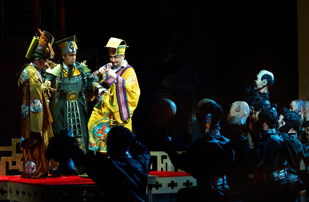 Этот спектакль потрясающе решен и по оркестровой, и по хоровой части. Невероятно чутким, музыкально тонким и психологически податливым звучание оркестра предстало под управлением главного дирижера театра Рената Салаватова. Элегантно изысканными с точки зрения передачи многогранной палитры эмоциональных состояний оказались поистине «живописные» хоровые страницы партитуры (главный хормейстер – Любовь Дразнина). Хор и оркестр лично мне доставили в этот вечер удовольствие несравненно большее, чем солисты, хотя весь квартет главных героев и подобрался весьма добротным – именно таким, каким он и был на премьере 2012 года: Турандот – Оксана Крамарева (Национальная опера Украины им. Т. Шевченко); Калаф – Ахмед Агади (Мариинский театр); Лиу – Жаннат Бактай (Астана Опера); Тимур – Сергей Ковнир (Национальная опера Украины им. Т. Шевченко). Из этой четверки безупречным во всех отношениях зарекомендовал себя потрясающе рафинированный бас и прекрасный актер Сергей Ковнир, показавший настоящий класс высокоинтеллектуальной и глубоко прочувствованной интерпретации этой не самой эффектной во всей опере партии.