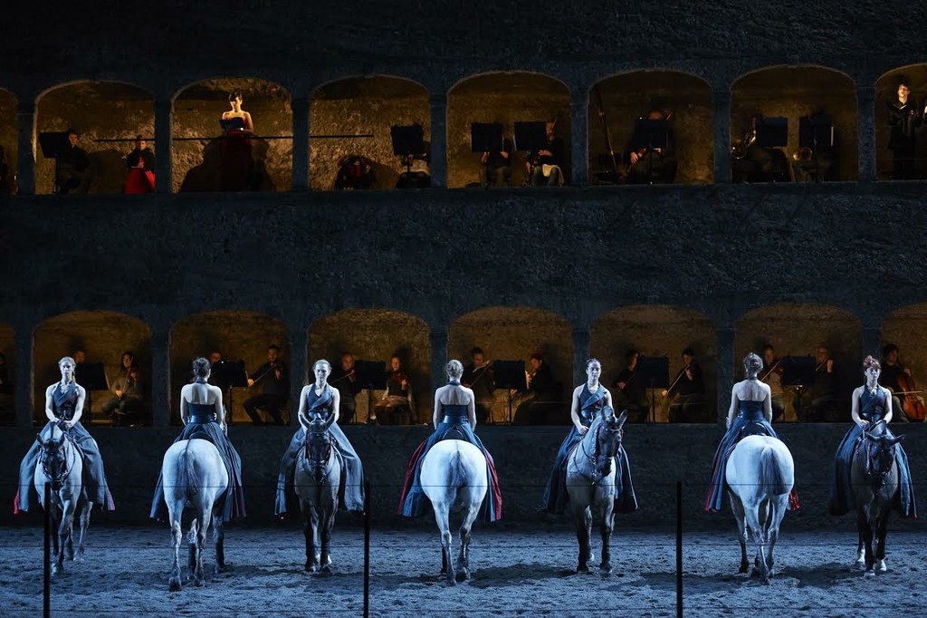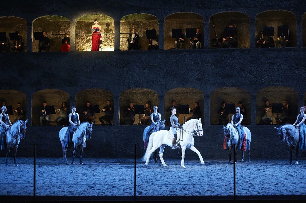 «Музыканты Лувра-Гренобля», зальцбургский Bachchor и солисты – восходящая звезда бельканто, французская меццо-сопрано Марианн Кребасса, главная надежда зальцбургских меломанов, баварская сопрано Кристиане Карг (об ее «цветочном» лидерматине – в следующем фестивальном репортаже) и французский тенор, уже стяжавший себе славу одного из самых востребованных и интересных во всех отношениях молодых певцов нашего времени, Станислас де Барбейрак разместились в скальных ложах и оттуда пели и музицировали. Минковский стоял внизу слева, практически среди зрительского партера, без всякого подиума, и оттуда руководил процессом. Сцена, импровизированные кулисы-стойла, часть партера были отданы на откуп Бартабасу и артистам его Академии верховой езды – знаменитому лошадиному театру «Зингаро».